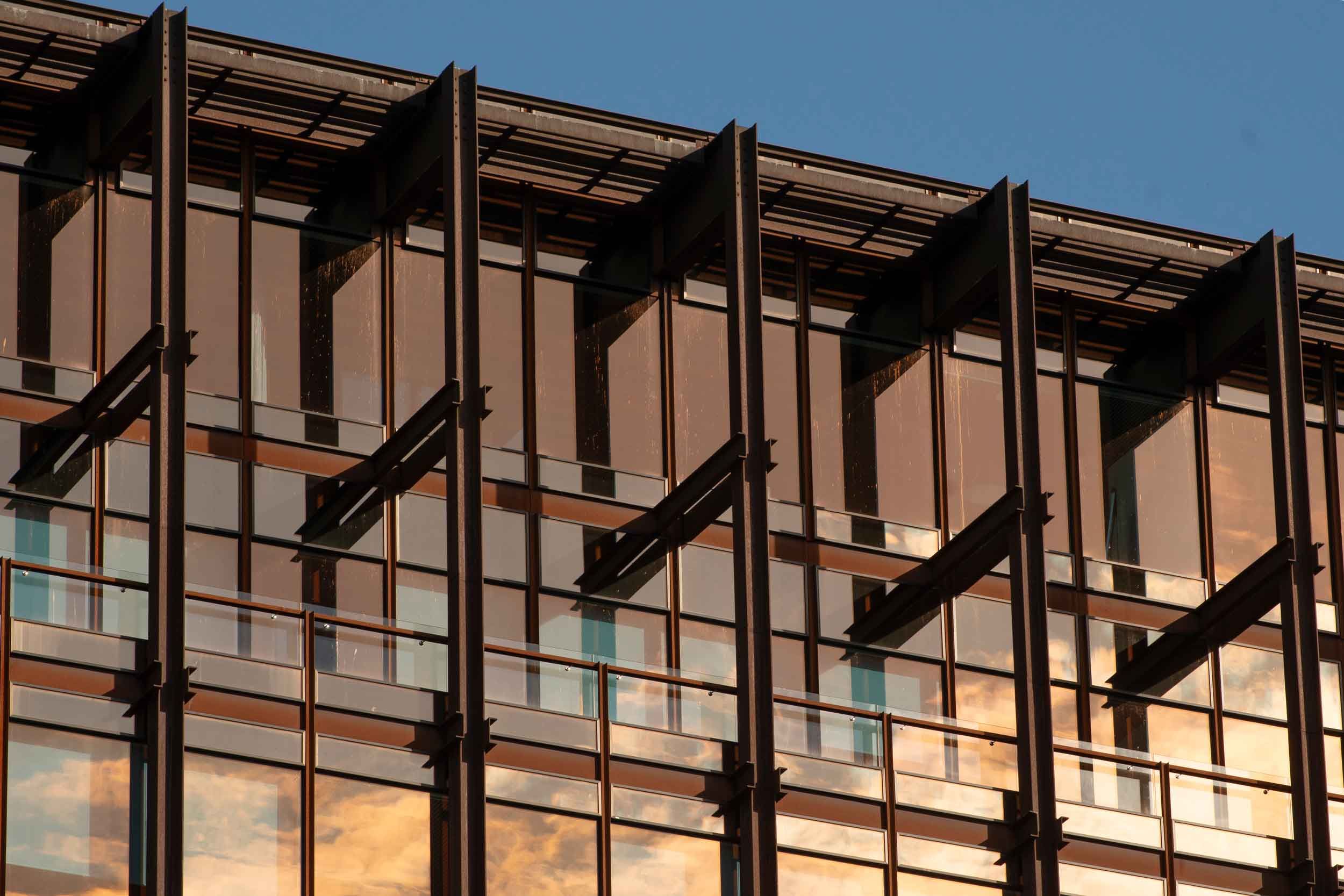 De originele buitengevel van weervast staal (‘corten’) bleef behouden. De interventie waarrond het ontwerp opgebouwd is, is een cirkelvormige vide die centraal in het plan gecreëerd wordt. De nieuwe hal, met een diameter van bijna 21 m en drie verdiepingen hoog, scharniert tussen voor- en achterbouw en verbindt zo de parking met het hotel en de kantoren.