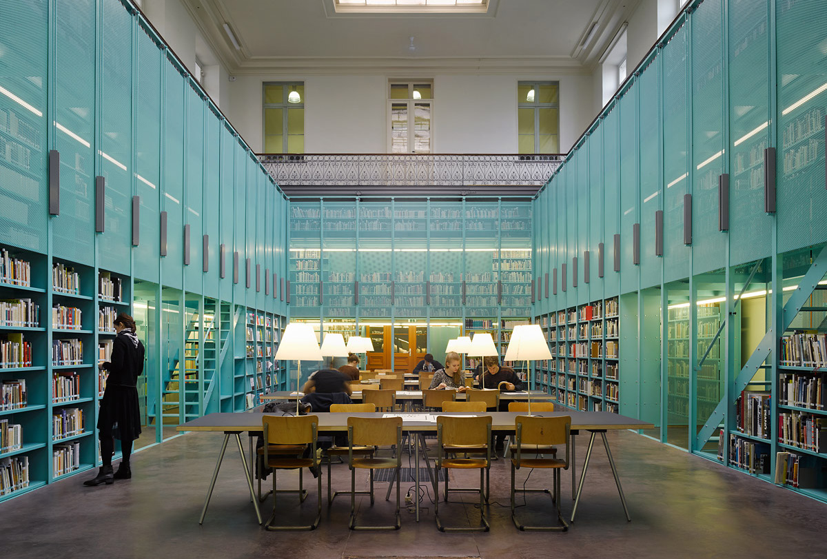 La nouvelle bibliothèque destinée au département Architecture et Urbanisme de l’Université de Gand a été conçue comme un grand meuble à trois étages ressemblant à un pavillon qui occupe l’espace sous le balcon de l’ancienne salle de pratique. Le périmètre de la bibliothèque est délimité par des armoires, en d’autres termes par des livres. En glissant une grille au rythme du périmètre, la collection est accessible ou non afin de protéger les livres lors d’autres activités, comme des réceptions et des lectures, etc.  Avec un entraxe de 1 m, de fines ailettes en acier d’une épaisseur de 6 mm se profilent comme les portiques d’un mouvement circulaire qui comporte de nombreuses fonctions.  Une plaque modulaire pliée peut être placée en outre dans « le placard » accessible comme radier, étagère, marche et bureau. Tout comme pour les étagères pliées, il était en effet important de conserver la construction aussi finement détaillée, élégante et légère que possible tout en faisant en sorte qu’elle supporte le poids gigantesque des livres.