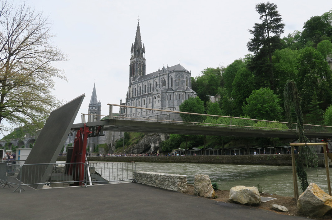 Le site du Sanctuaire de Lourdes est un lieu chargé d’histoire, de spiritualité et de silence. En juillet 2013, une crue a provoqué d’importants dommages aux ouvrages existants, ce qui a poussé le Sanctuaire à se positionner sur une réponse intégrée.  Afin de laisser passer la « colère » du Gave de Pau, une passerelle a été conçue pour se lever grâce à un système de vérins hydrauliques logés dans les culées de l’ouvrage.  Ruban de métal reliant les deux rives, la passerelle se caractérise par sa finesse (40 cm d’épaisseur pour 38 m de portée).  Les crues sont fréquentes, et minimiser l’épaisseur de la passerelle a permis de retarder la levée de celle-ci. La structure et le platelage sont réalisés en inox duplex, matériau remarquable pour ses qualités esthétique et mécanique. L’inox est sablé pour assurer une adhérence correcte et rendre la texture matte, noble, intégrée. De plus, le platelage est perforé sur base d’un dessin artistique aléatoire.
