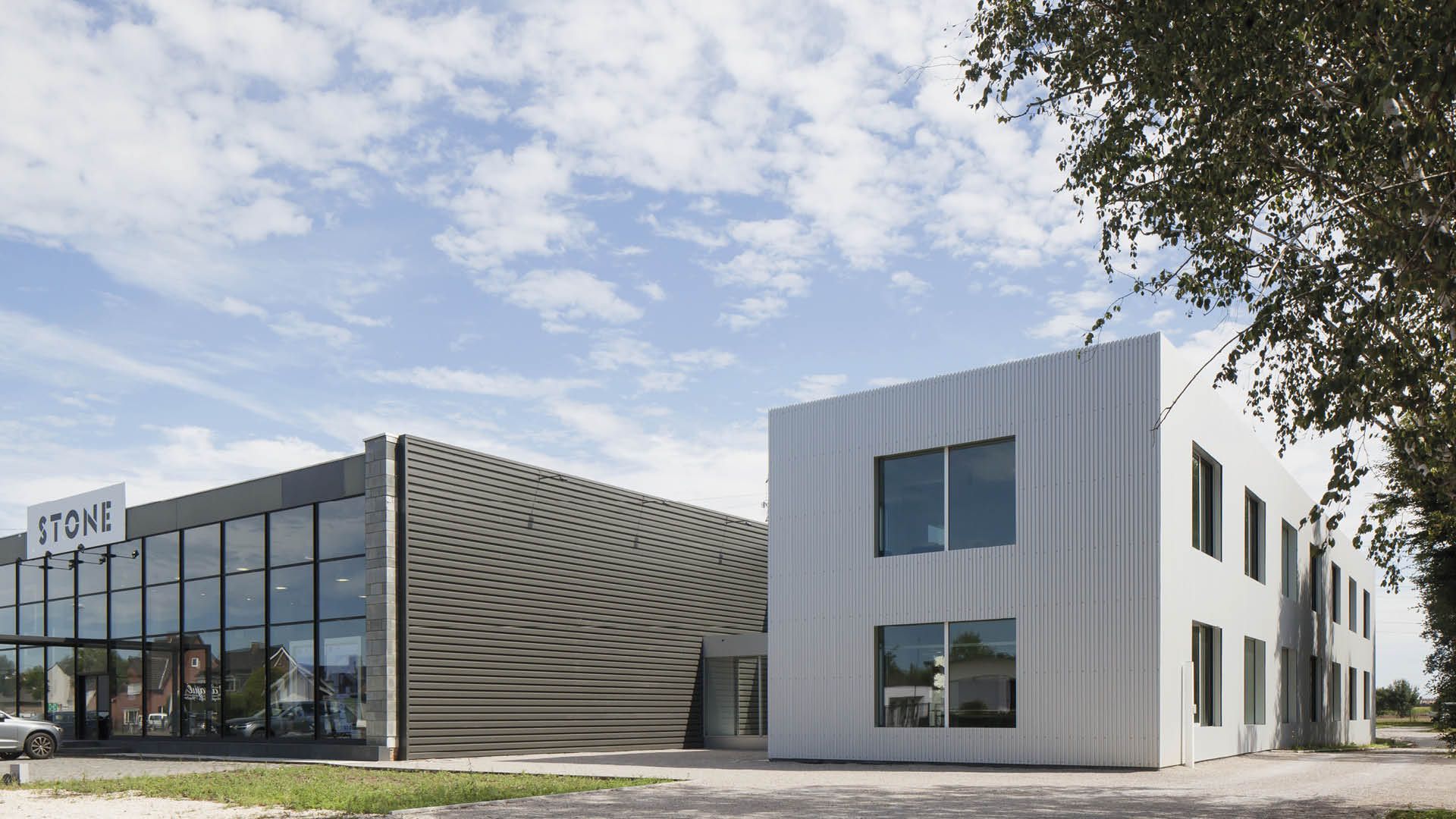 Malgré qu’il s’agisse d’une entreprise de transformation de la pierre naturelle, toutes les façades sont finies avec un revêtement métallique profilé. Cette finition de façade crée une cohérence visuelle entre le nouveau et l’existant. De subtiles nuances de couleur et le degré du détail différencient les volumes selon leur fonction spécifique.