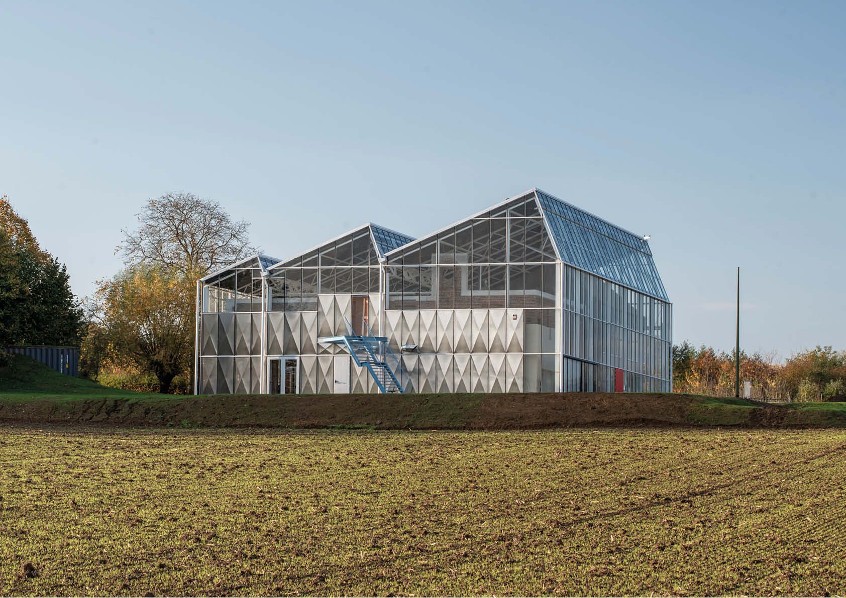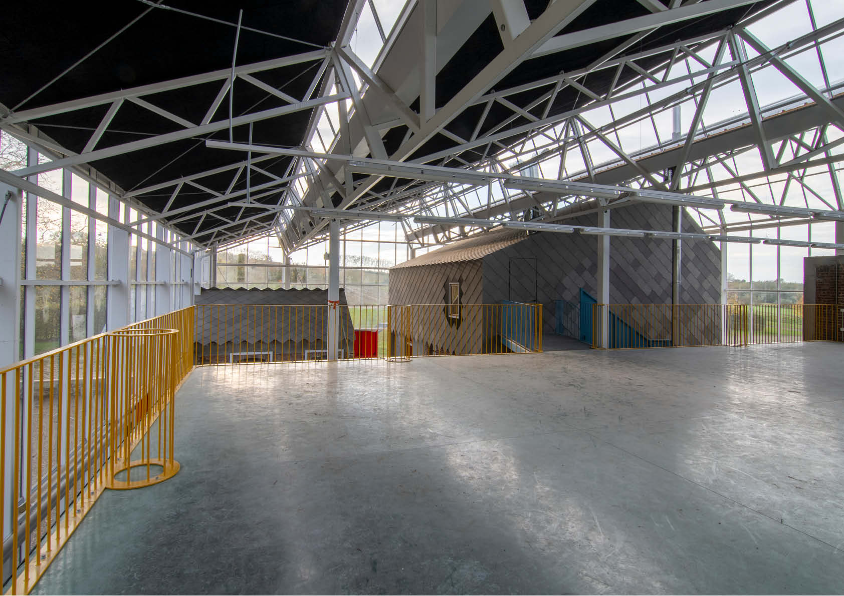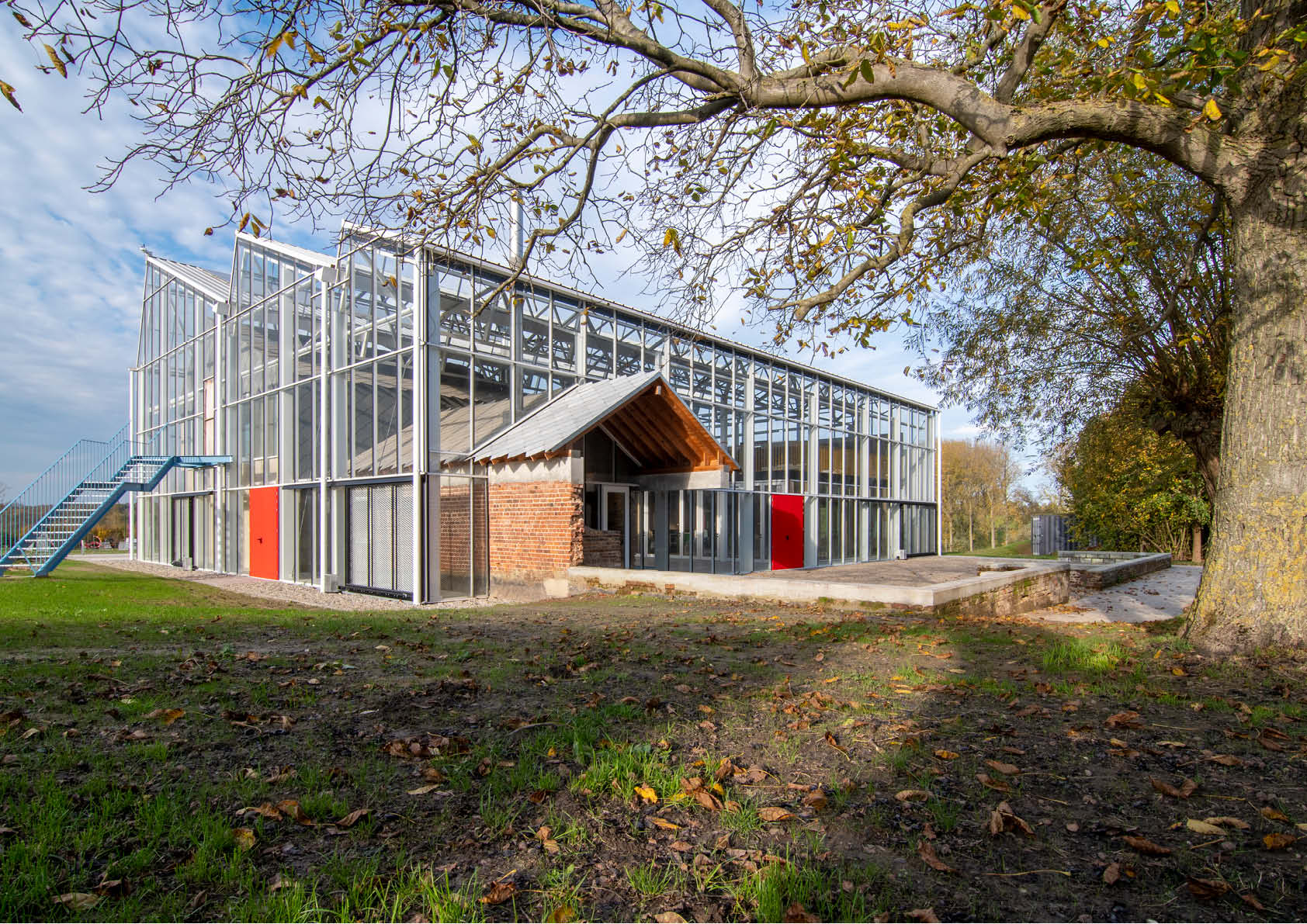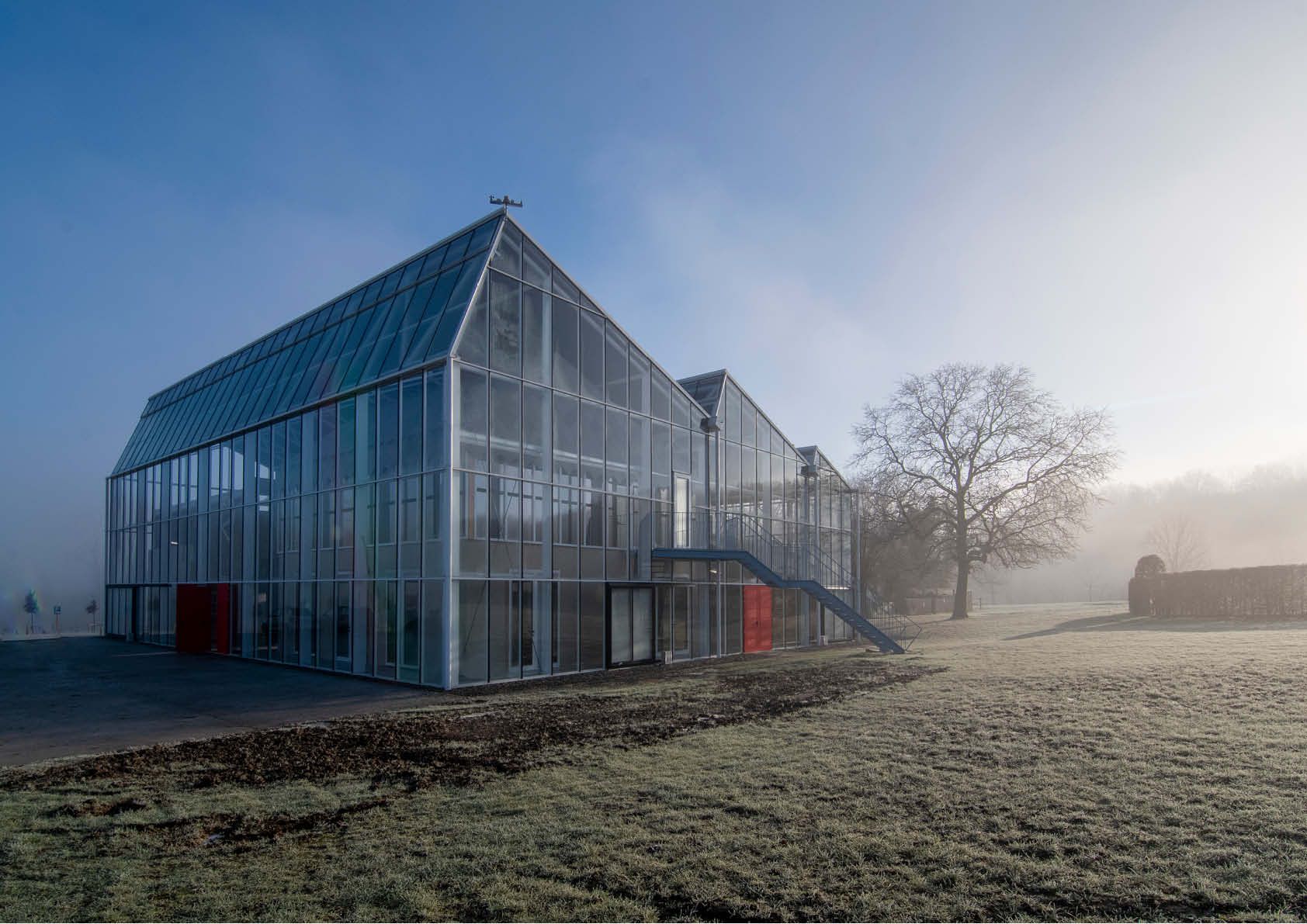 La serre, qui a été construite autour d’un squelette en acier — bon pour 23 tonnes — a une toiture à redans inclinée, qui permet un éclairage idéal depuis le nord. Un climat intermédiaire prévaut au sein de la serre non chauffée. Les visiteurs y sont à l’abri de la pluie et du vent et peuvent quand même profiter de la vue magnifique sur la région.