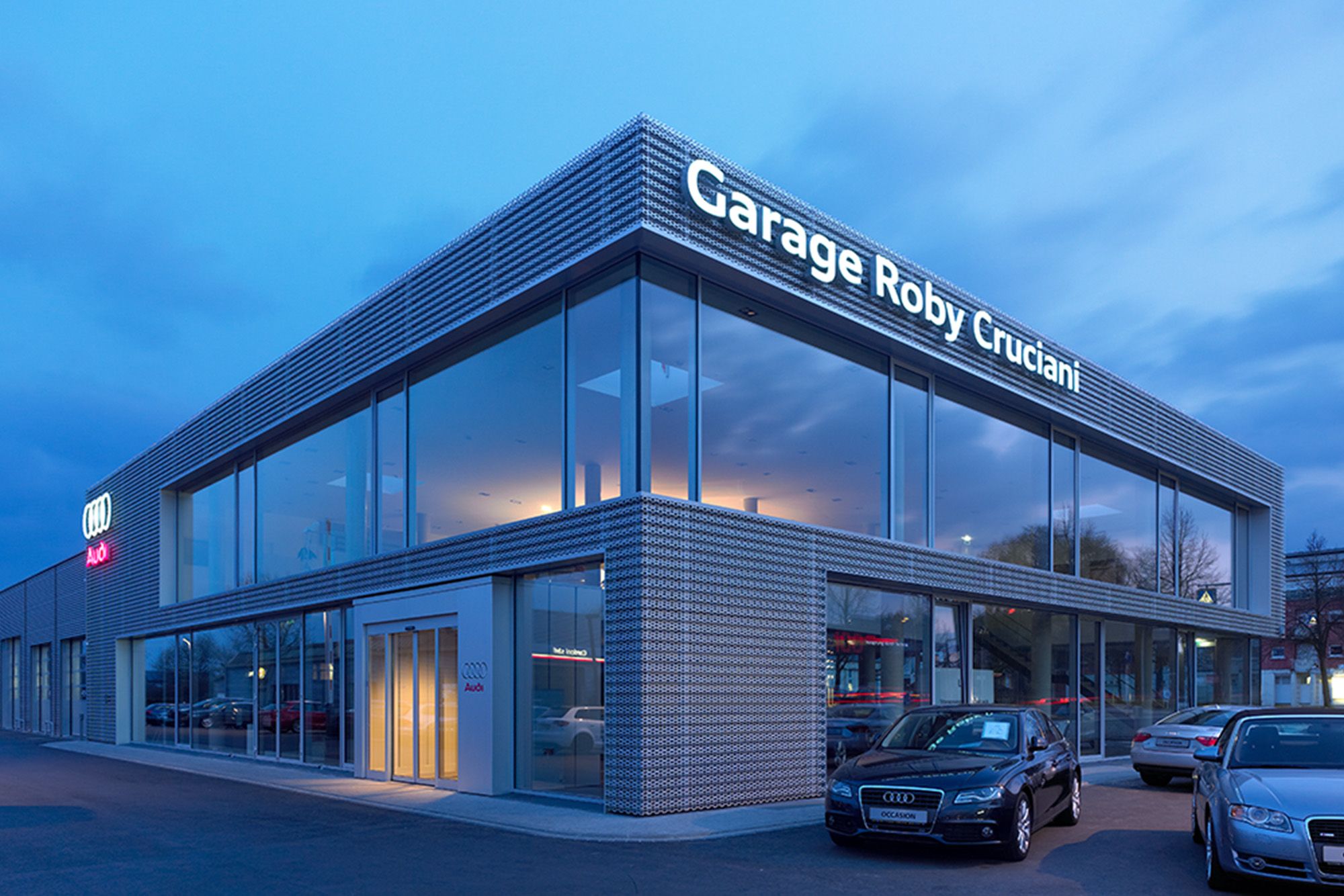 Le garage est un point de vente officiel pour voitures Audi. Le bâtiment doit dès lors correspondre aux critères précis du constructeur automobile qui impose un certain nombre de détails et de finitions.