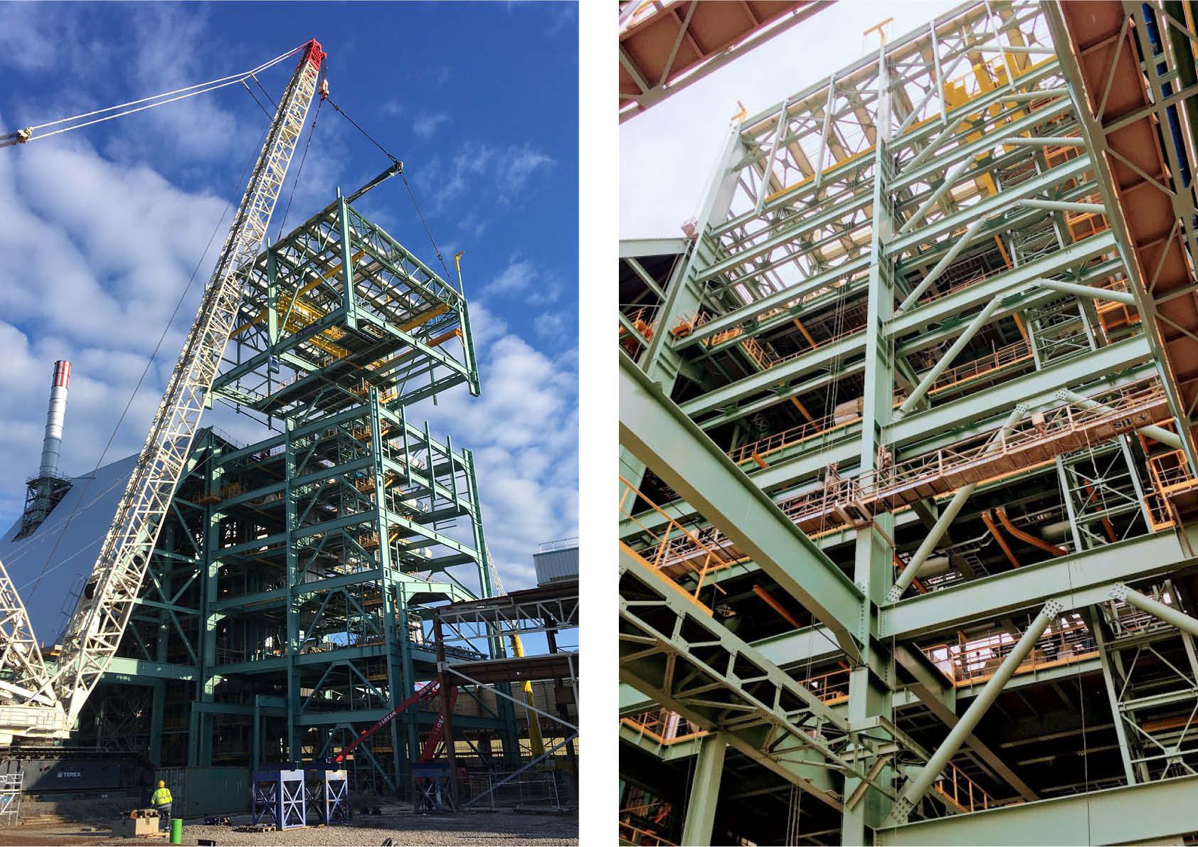 Het torengebouw staat op een oppervlakte van 23x25m en heeft een hoogte van 60m. Ook hier werden de 6 zware kolommen uit plaat samen gelast. Voor de diverse (proces)vloeren werden hoofdzakelijk gewalste profielen gebruikt. De vloeren zijn bedekt met traanplaat en werden afgeschermd met leuningen. In totaal werd circa 2.500 ton staal verwerkt. De fabricage werd volledig uitgevoerd in de werkplaatsen, waarna alle onderdelen naar de bouwplaats werden getransporteerd en gemonteerd.