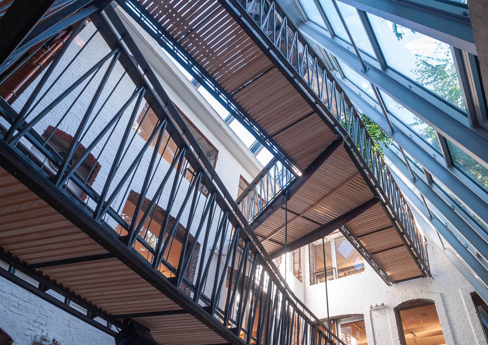 Staal is de rode draad in bijna alle architecturale ingrepen, van de verhoogde gevel aan de straatkant tot de nieuwe achtergevel, de glazen koepel en een fantastische circulatievoorziening met trappen en passerelles die leven en werk in het neoklassieke gebouw opnieuw definiëren.