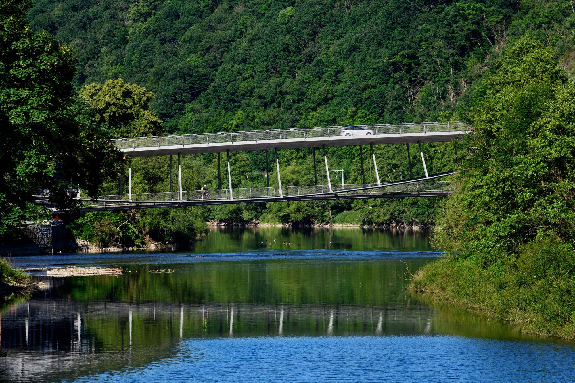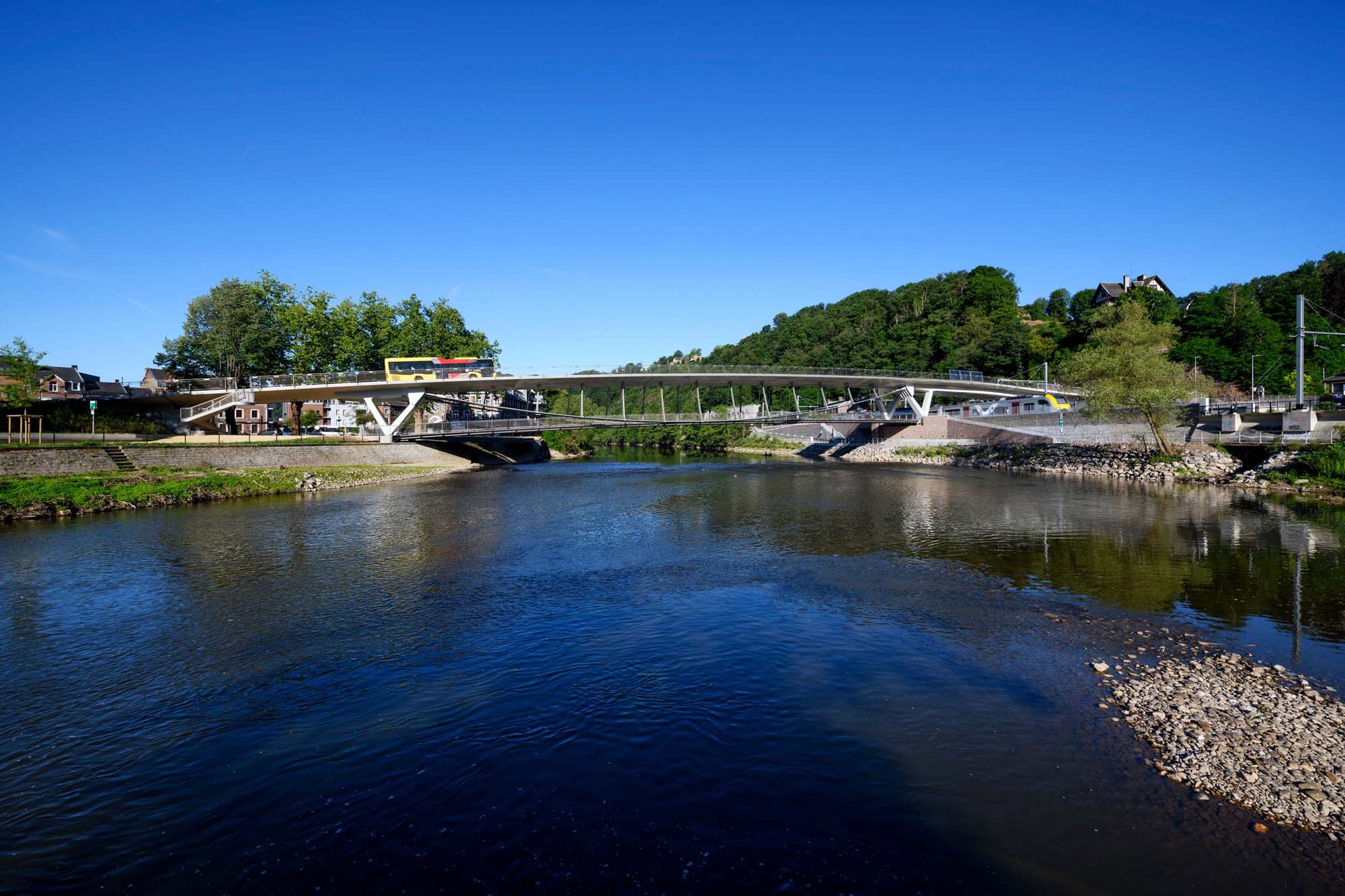 De nieuwe brug in Tilff, nabij Luik, over de Ourthe vormt een nieuwe multimodale verbinding voor de omgeving. Ze bestaat uit een verkeersbrug met een voetgangersbrug op een lager niveau.