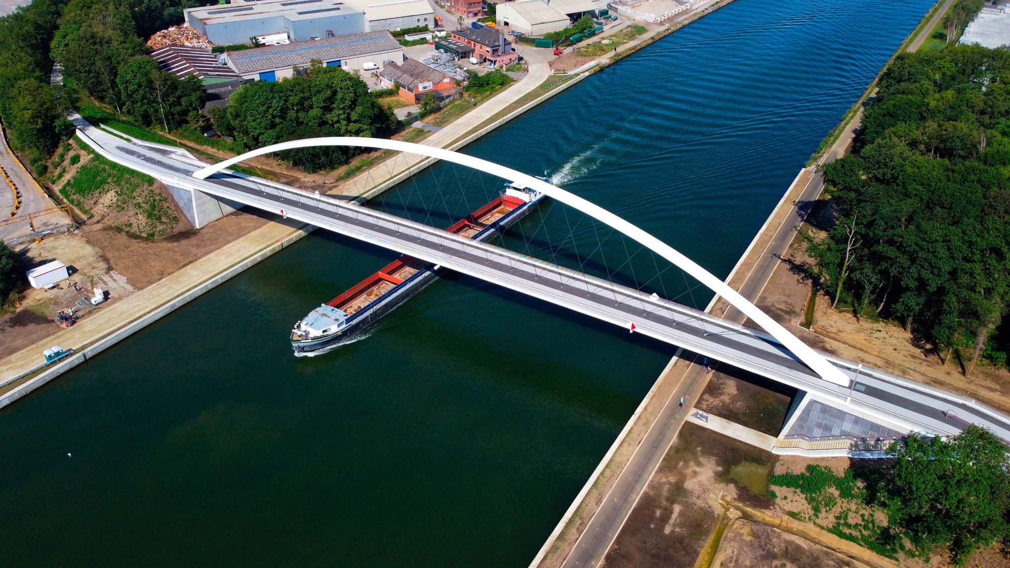 In Tessenderlo werd een bestaande kanaalbrug vervangen door een nieuwe stalen voetgangers- en fietsersbrug. De boogbrug is 22 m hoog en overspant in één veld 137 m. De enkele boog staat in de as van de brug.